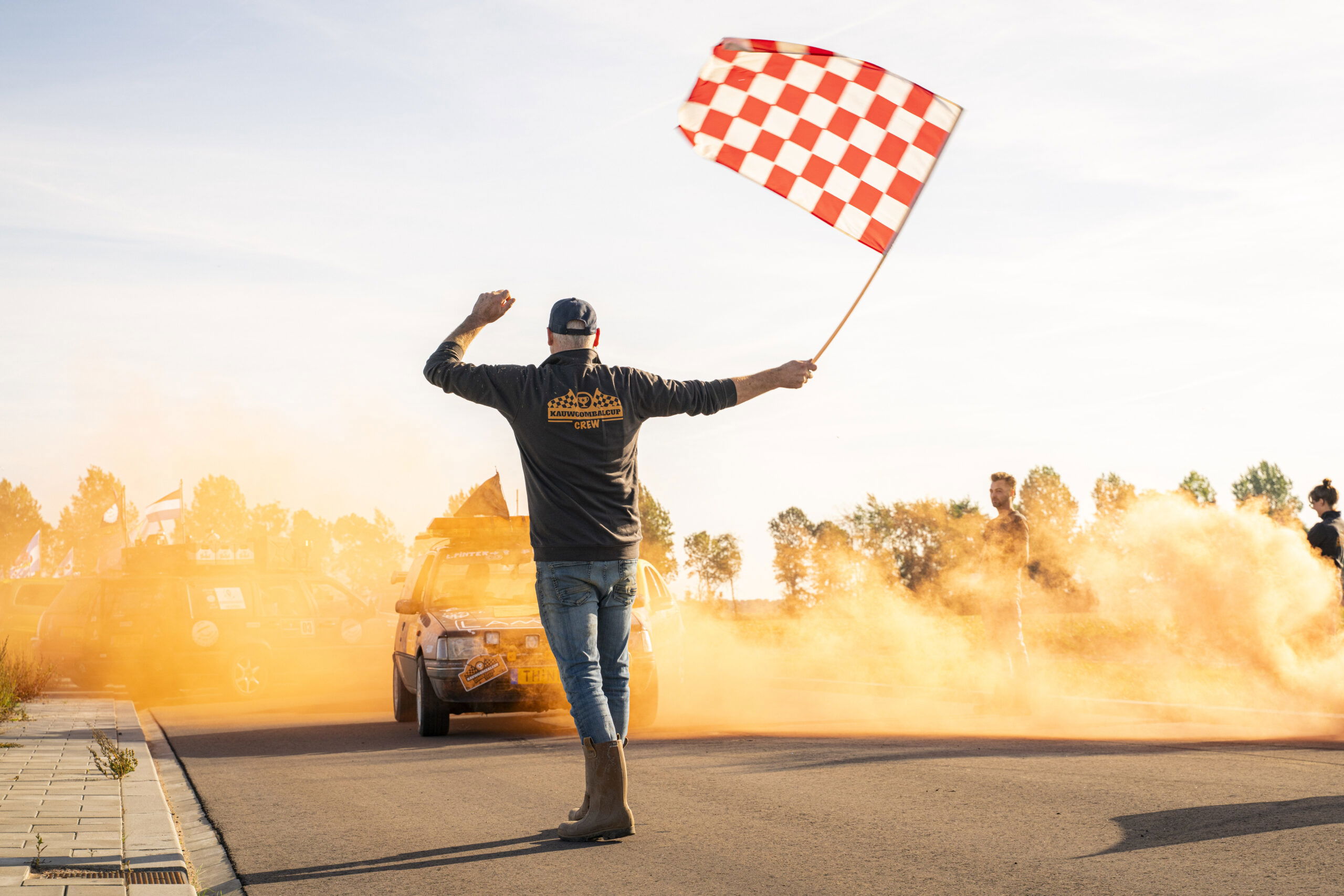 Een gepersonaliseerde vlag met de teamnaam van minimaal 1 meter op de auto.